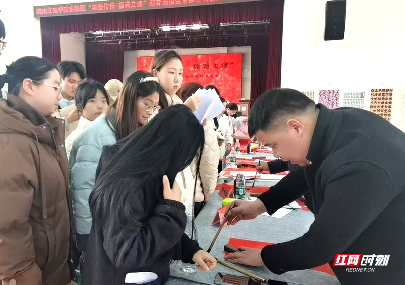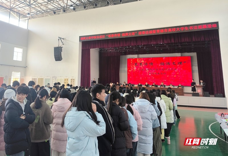 红网时刻新闻1月7日常德讯(通讯员 梁飞熊)1月6日下午,由湖南文理学院东校区管理办公室(筹)与常德市书法家协会联合主办,常德市青年文艺交流协会、常德市青年书法家协会协办的“笔墨送福·福满文理”迎春送福暨常德市高校大学生书法巡展活动,在湖南文理学院东校区体育馆圆满举行。