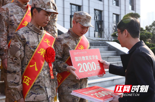 领导还为新兵们一一佩戴光荣花,该校为每人颁发2000元国防教育奖学金。