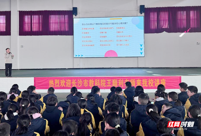 “头头拍拍,肩肩拍拍……”詹乐贫中学的培训现场,《金龙拍拍操》的欢快节奏瞬间点燃氛围。本次培训特邀湖南省中小学心理健康与生涯教育专业委员会副秘书长王顺利授课,他以“心理危机的识别和应对”为核心,通过“感冒症状与应对”的生活化提问引发共鸣,进而延伸至心理“感冒”的识别与干预,瞬间激活现场氛围。随后的“一站到底”互动游戏,更是让学生在轻松愉悦的氛围中,快速建立心理健康认知,掌握基础心理调适技巧,实现趣味体验与知识习得的双重收获。